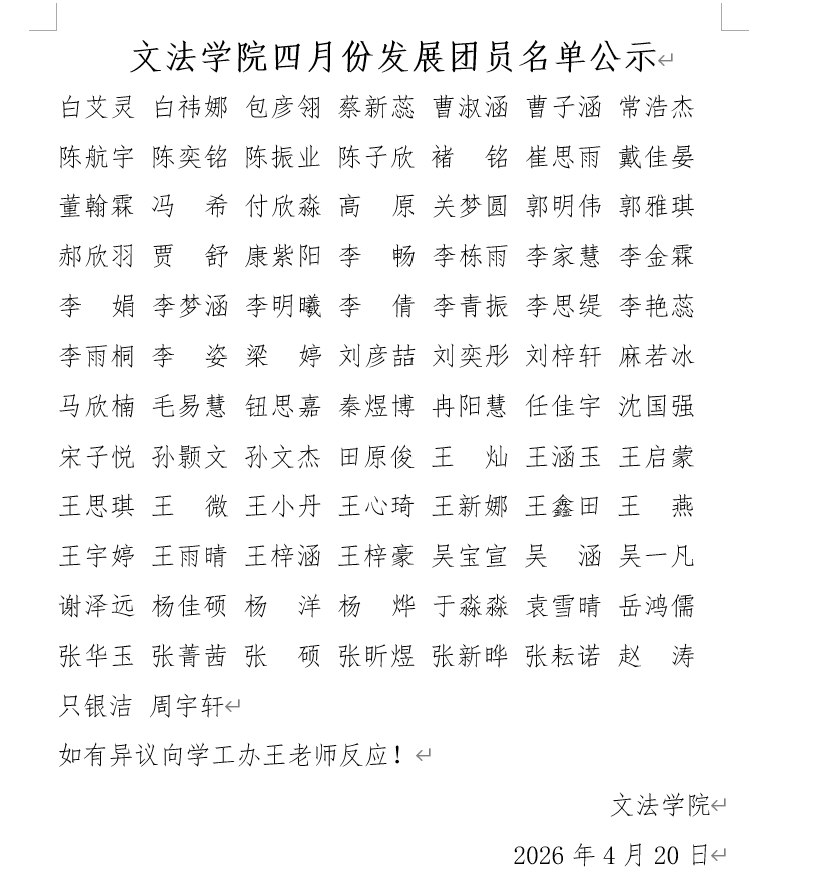 2026年文法学院四月份发展团员名单公示