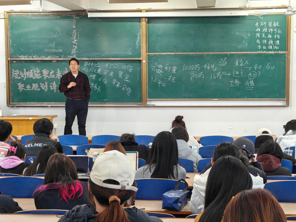 本次讲座由文法学院学工办主任陈诚老师主讲。陈老师深耕学生素质教育和职业规划指导,具备丰富的职业规划教育实践经验。讲座中,陈老师围绕行业趋势与岗位需求,从大家都熟悉的股票入手,讲到现在的时事政事,引导学生开展深度自我认知和社会认知。同时陈老师采用板书加讲述的方式,通过生活中常见的例子讲述金钱固然重要,但不是生活的全部,借此说明职业规划的重要性。通过此次讲座,同学们不仅打破了原有挣大钱的幻想,能够脚踏实地地明晰职业目标,掌握了实用的求职与考研备考技能,还树立了科学的职业规划意识,有效破除了职业认知误区,纠正了盲目就业心态。最后,陈老师给予大家期许:希望每一个文法学子都能脚踏实地,不要透支自己的未来,明确目标,都能拥有一个独特的人生。